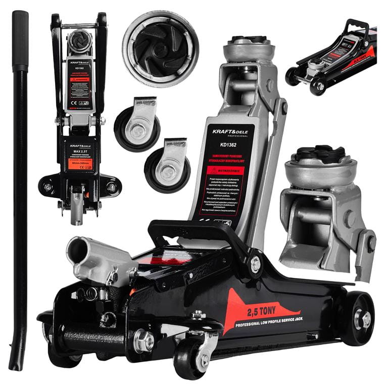 Підкатний домкрат Kraft&Dele KD1362 є гідравлічним інструментом, розробленим для інтенсивної експлуатації в майстернях. Принцип роботи базується на переміщенні робочої рідини в циліндрі під тиском, що створюється рухом важеля, забезпечуючи підйом опорної п'яти. Конструкція виготовлена з високоякісної сталі, стійкої до деформацій під навантаженням. Модель оснащена надійною системою перепускних клапанів, які захищають механізм від перевантажень, запобігаючи підйому ваги, що перевищує номінальні 2,5 тонни. Корпус має антикорозійне покриття, що подовжує термін служби інструменту при роботі в агресивному середовищі автосервісу. У комплекті постачання передбачена знімна ручка, що полегшує транспортування та зберігання домкрата. Вузол підйому має широку опорну чашку, яка забезпечує надійний контакт з елементами кузова або рами автомобіля, мінімізуючи ризик пошкодження лакофарбового покриття або металу.